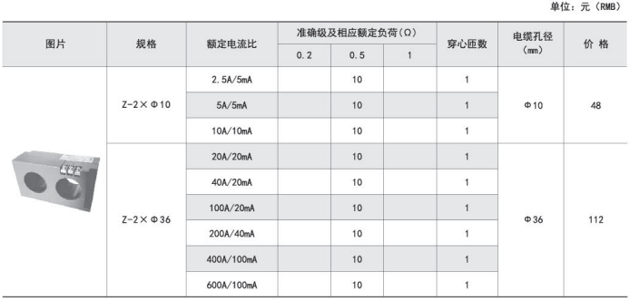 | 規格 | 額定電流比 | 準確級及相應額定負荷(VA) | 電纜孔徑 | 安裝方式 | ||