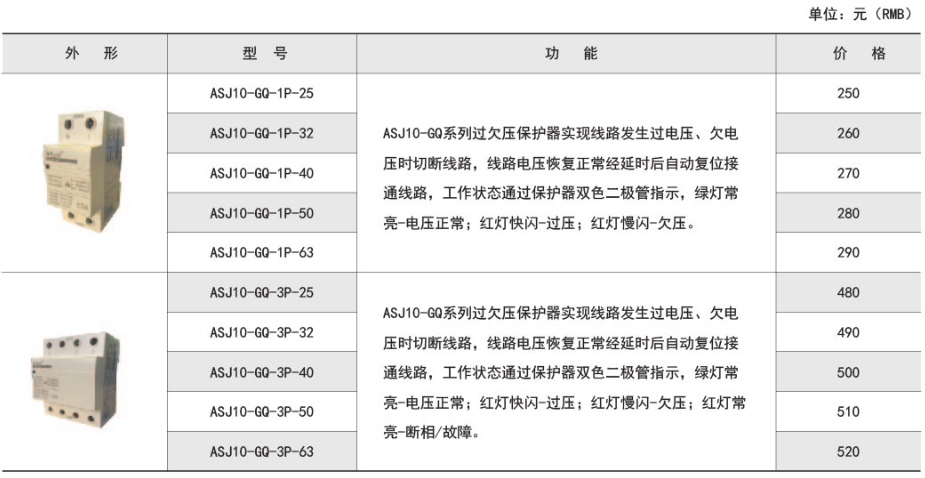 ASJ10-GQ系列自復(fù)式過欠壓保護(hù)器(以下簡(jiǎn)稱ASJ),適用于單相交流電壓230V或三相電壓400V,頻率50Hz,額定工作電流至63A及以下的用戶或負(fù)載。由中性線故障引起的單相或三相線路過、欠電壓時(shí),保護(hù)器對(duì)用電設(shè)備進(jìn)行保護(hù)。