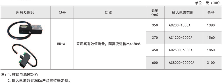 | BR-AI | 采用真有效值測(cè)量,隔離變送輸出4-20mA | 350 | AC200-1000A |